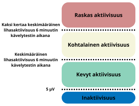 Kuva 1. Lihasaktiivisuus alle 5 µV (inaktiivisuus), alle keskimääräisen lihasaktiivisuuden kävelytestin aikana (kevyt), yli keskimääräisen lihasaktiivisuuden kävelytestin aikana (kohtalainen) ja yli kaksi kertaa keskimääräisen lihasaktiivisuuden kävelytestin aikana (raskas).